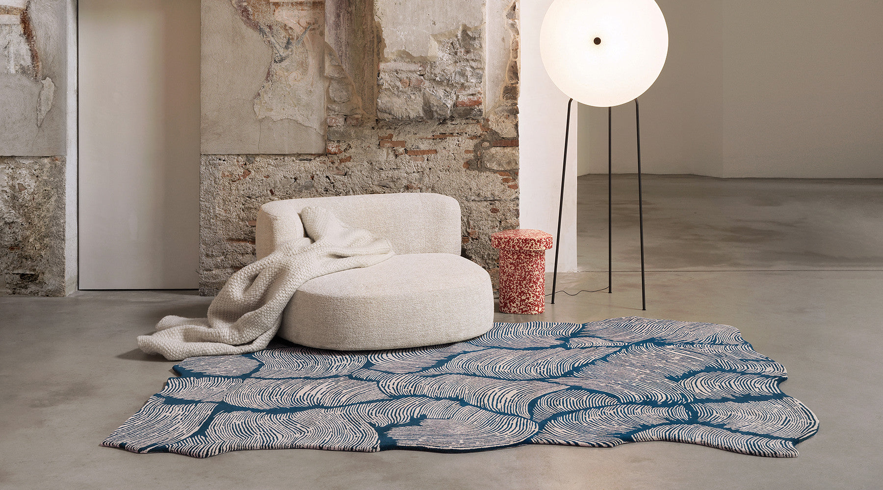 Créé par Studio Zero et fabriqué à la main en Inde, le tapis Oceano Round Blue est confectionné en laine naturelle selon la technique du tufté main. Avec une épaisseur d’environ 2 cm, il allie douceur, élégance et durabilité. Disponible en tailles standard Ø250 et Ø300 cm, il peut également être personnalisé en dimensions et coloris sur demande.